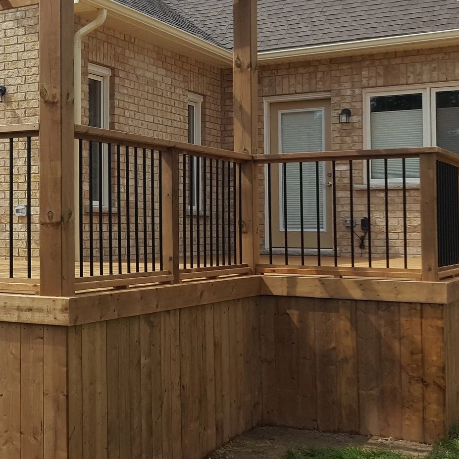 Deck railings can serve many purposes. Not only are they practical and required for safety, they also add style and beauty to your deck. Are you interested in maintaining your view? Consider our option of tempered glass railings. Want a classic looking, maintenance-free deck railing? Aluminum picket railings come in a variety of colours and textures. Customize your favourite and raise your deck space to a new level of style. We also install hundreds of decks with pt wood railings and vinyl deck railing every year.